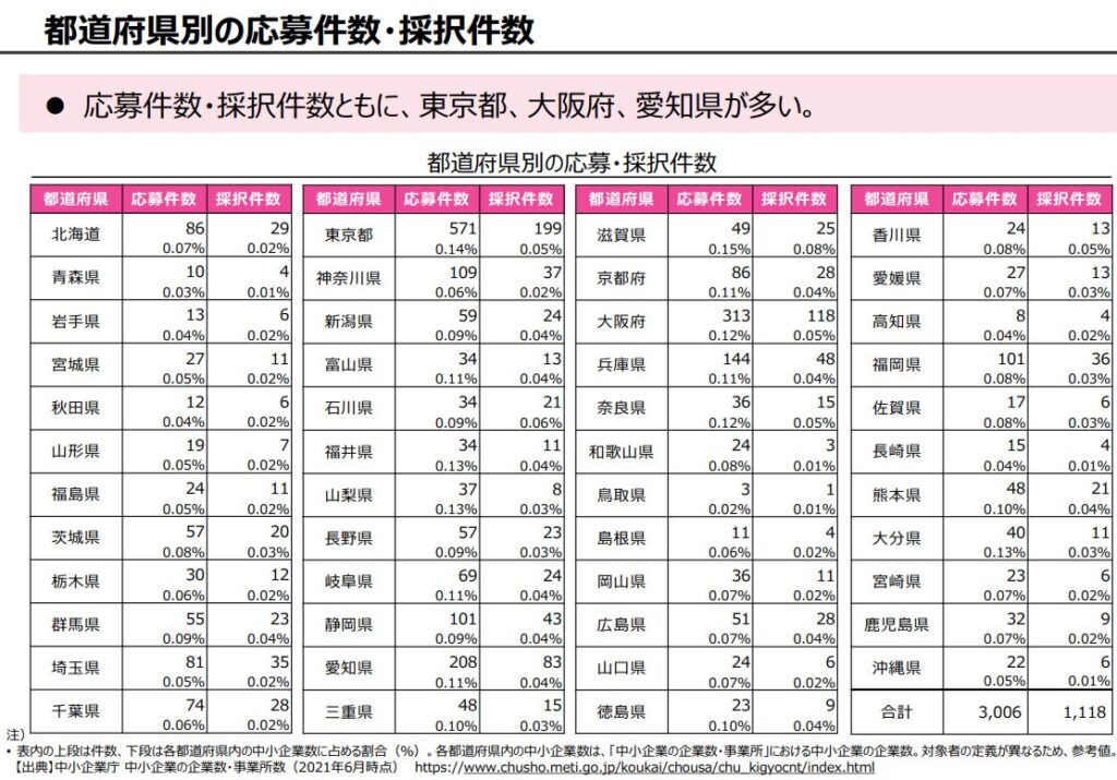 上記の表で、各枠の上段の数字は応募件数・採択件数を表し、下段の数値は各都道府県内の中小企業数に占める割合(%)を表しています。
