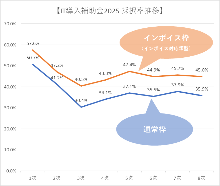 まずは、IT導入補助金2025の各次公募の採択率を確認してみましょう。
